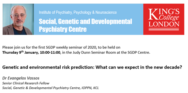 @SGDPCentreKCL seminars. This week,@VangelisVassos on risk prediction from genetic and environmental factors Thursday, 10am, Judy Dunn Seminar room, SGDP Centre,@KingsIoPPNpic.twitter.com/G8x0cq7eSF