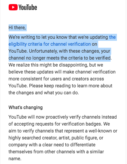 UPDATE: GET THIS, after daring to ask @TeamYouTube & @SusanWojcicki last night to explain WHY my channel is being targeted for destruction by their JAN 2019 algos changes, today YT sent me THIS email. They are retroactively removing my channel's "Verified" status. #YTmalevolence https://twitter.com/SGTreport/status/1174506756732534789 …pic.twitter.com/qZzQrqcyp0