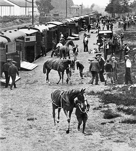 1934: Horses arriving by train to run at the Royal