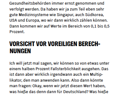 Hmm. Die Leute versterben nach 4-6 Wochen. Ist das berücksichtigt? Drosten hat bereits im ersten Podcast von 0,1-0,5% Sterberate gesprochen.