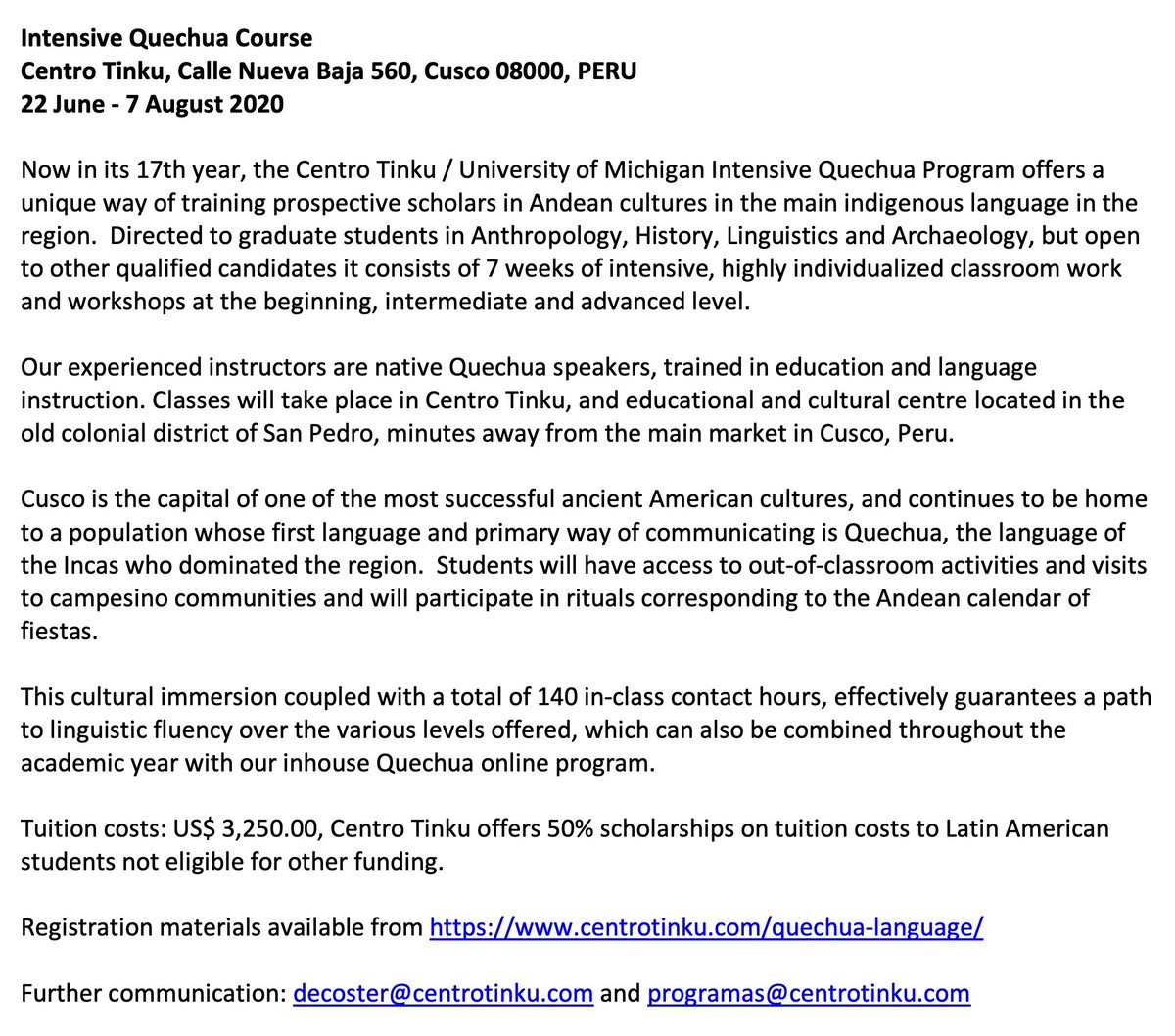 #LANGUAGE_COURSE: 'Intensive Quechua’, Centro Tinku, Calle Nueva Baja 560, Cusco 08000, PERU, 22 June - 7 Aug. See image for full details. For prospective scholars in Andean cultures, Directed to graduate students in Anthropology, History, Linguistics & Archaeology.pic.twitter.com/9KEB0RnVjT