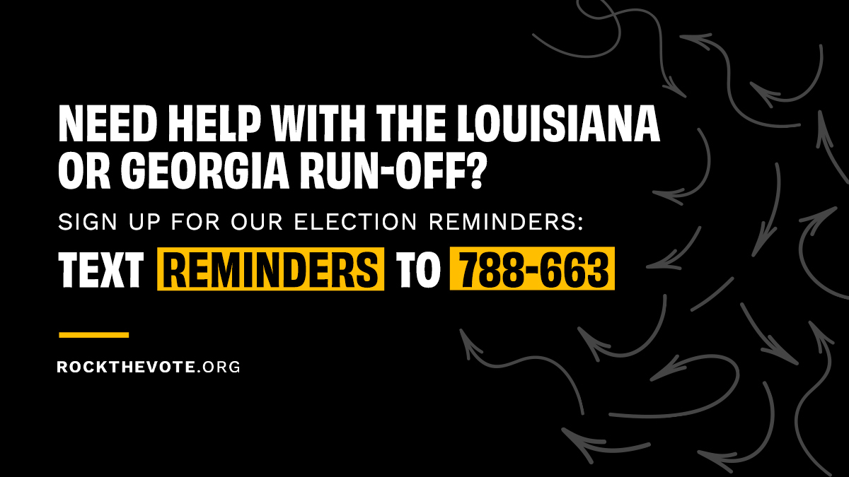 You know we got you! Text REMINDERS to 788-663 to get updates on deadlines for the upcoming run-off elections and any local elections in your area! Let's keep rocking the vote - democracy needs us.