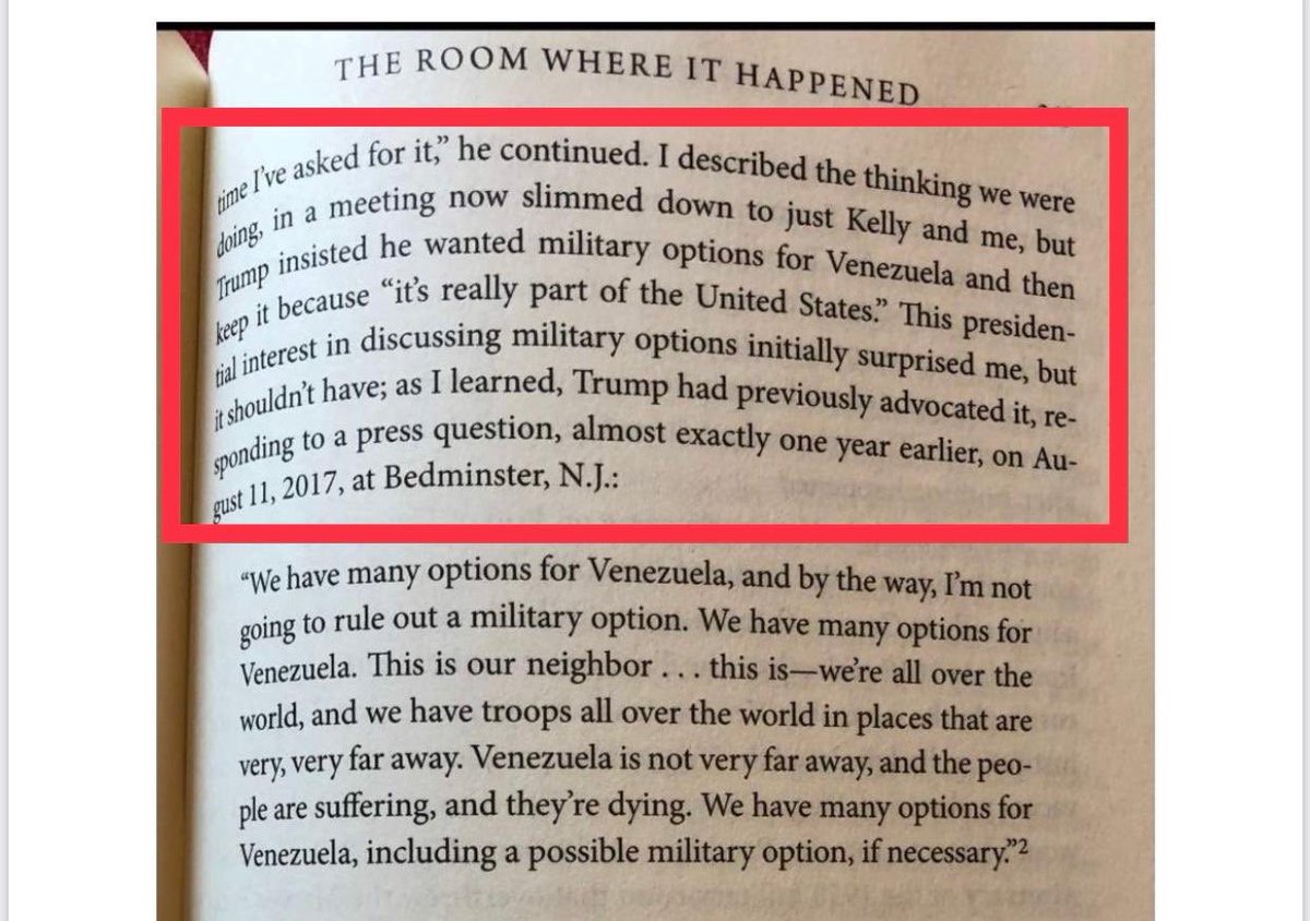 1/ Bolton dice textualmente en el libro: “Trump insistió en que él quería opciones militares para Venezuela y entonces QUEDÁRSELA porque ‘es realmente parte de EEUU’”. Es una anexión militar colonial tipo Puerto Rico lo que buscan estos genocidas.pic.twitter.com/VGJQzUZKdl