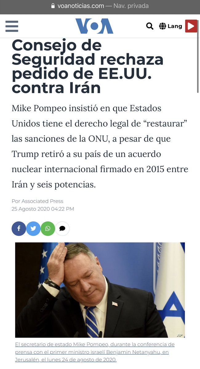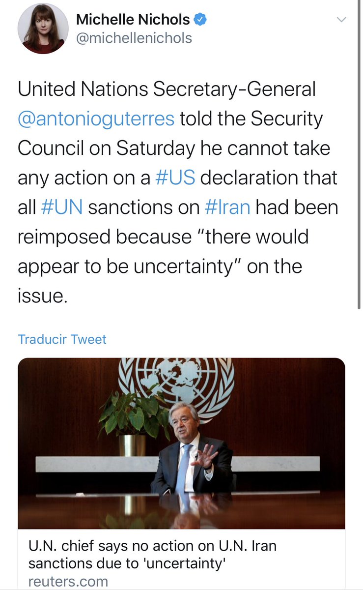 8/16 La arrogacia de Trump es tan brutal que, aunque renunciaron al acuerdo en 2018, afirma que “todavía son parte firmante” y puede exigir la aplicación de una cláusula que permite la reimposición de las sanciones. Es un acto de destrucción del propio Consejo de Seguridad ONU.pic.twitter.com/3tngRt4su9