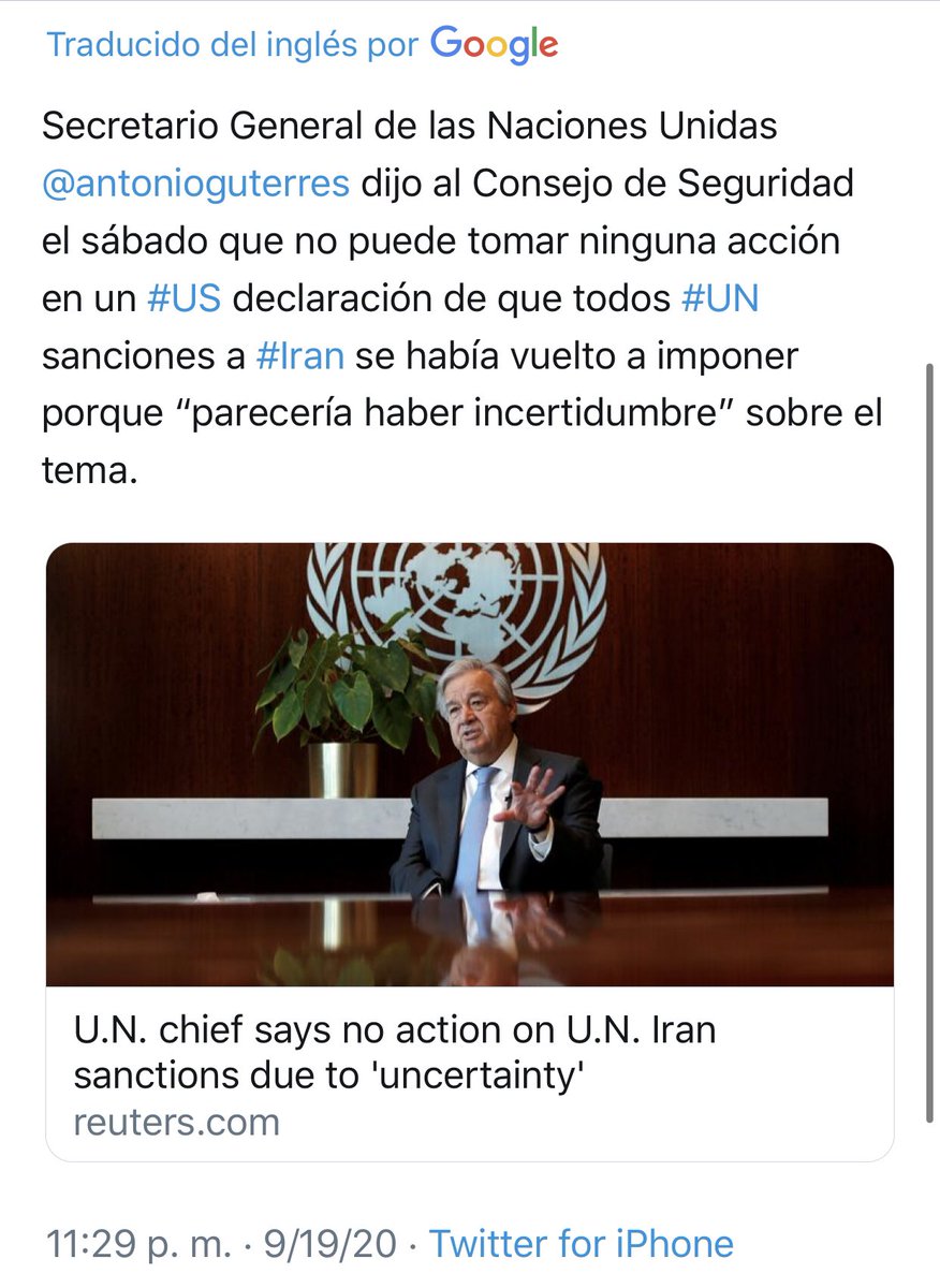 Secretario General de la ONU, Antonio Guterres, dijo al Consejo de Seguridad ONU que no puede actuar sobre las demandas de Trump contra Irán porque “hay incertidumbre” en el tema. Lenguaje cuidadoso para decir que Trump es un peligroso violador del derecho internacional.pic.twitter.com/yM0QZXsmn3