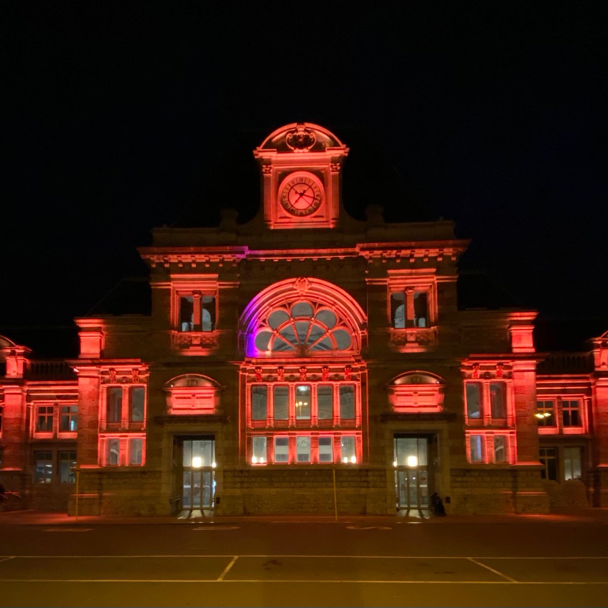 Afin de mettre en lumière la Journée internationale pour l'élimination de la violence à l'égard des femmes, la gare de Tournai est illuminée d’une lueur orange. La