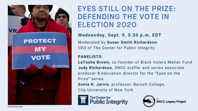 On Sept. 9th, the SNCC Legacy Project is co-sponsoring this voter engagement webinar with @publicintegrity. Register now!pic.twitter.com/w68iT3Mat5