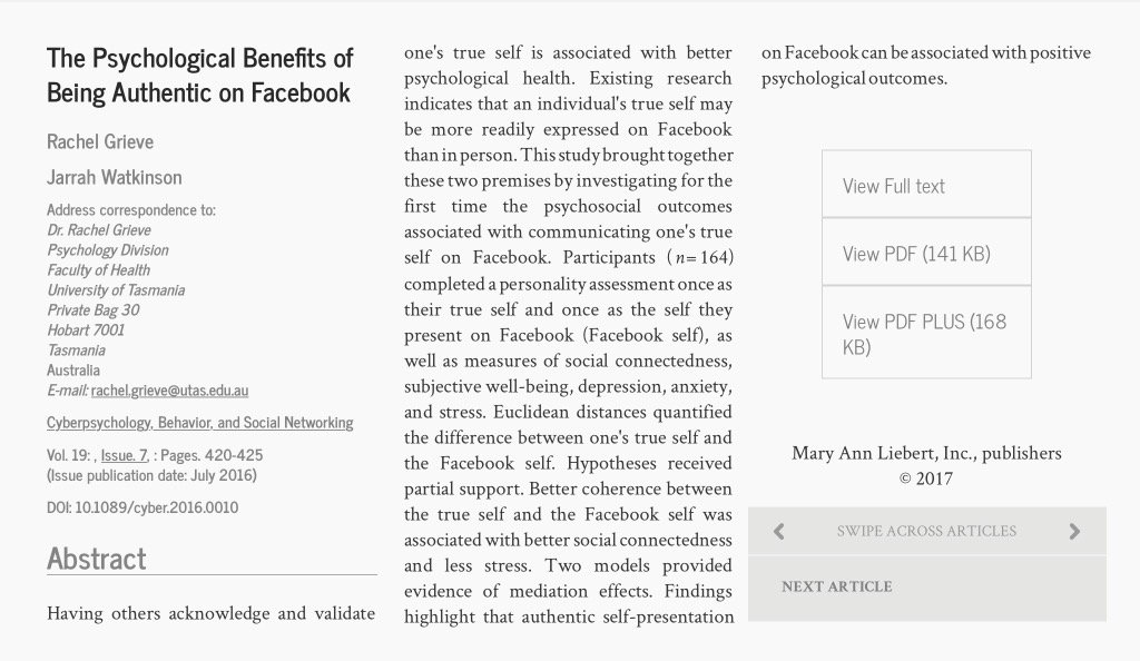 'Being authentic on Facebook, etc is better for your mental health than faking it'. http://online.liebertpub.com/doi/10.1089/cyber.2016.0010 …pic.twitter.com/cIu3rxYF8x