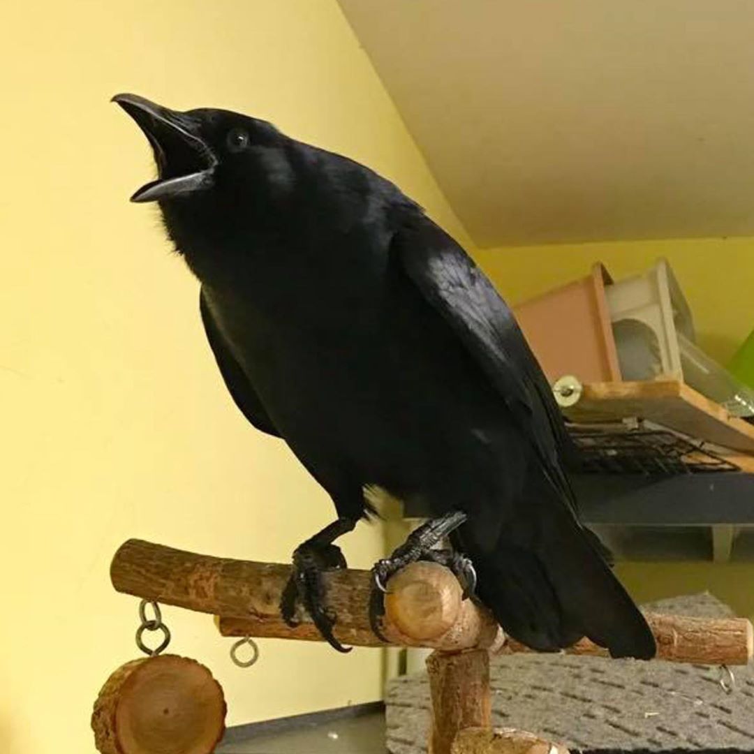 This is Poe our resident rescued crow. Since crows are very social species and live in large extended family groups, he could not be released by himself. He seems happy living at STAR and now learned to speak! He greets us every morning with a loud "Hello"!