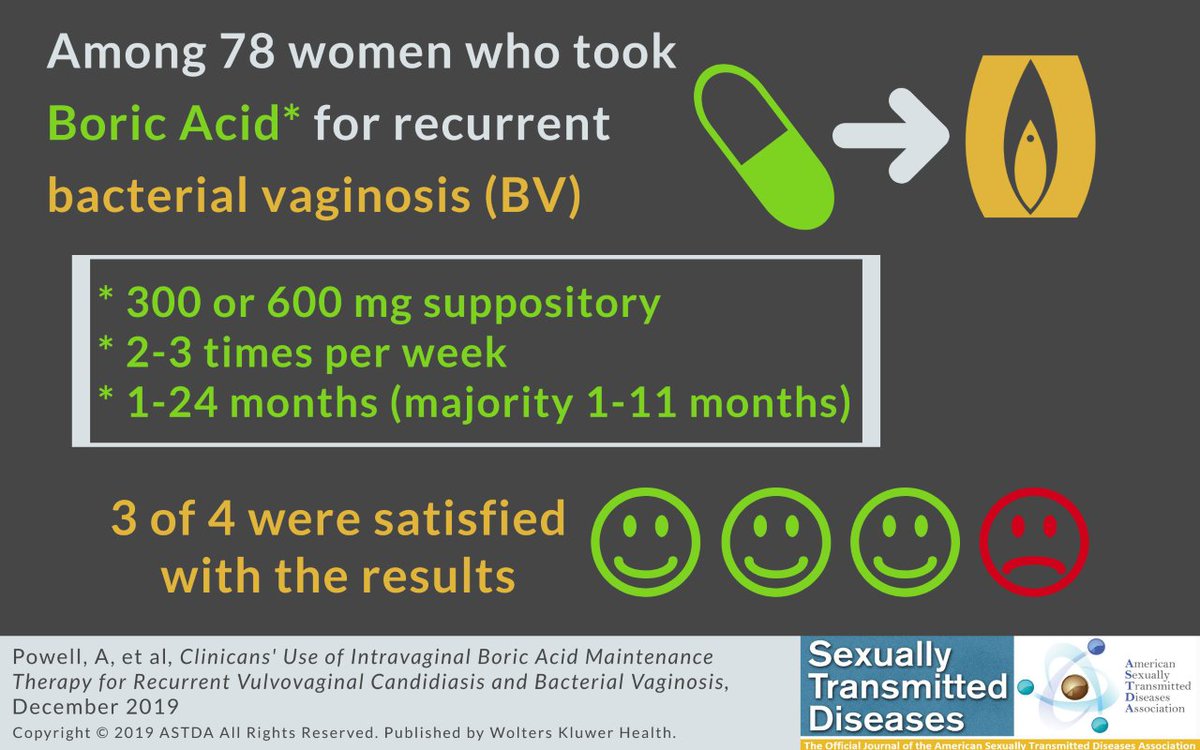 #vaginas and disturbances in the#microbiome. Among people with recurrent BV, boric acid suppositories 2-3 times/week may provide relief, but it's a time commitment. Most used them for 1-11 months, some up to 2 years.pic.twitter.com/Z8uVODHGyk