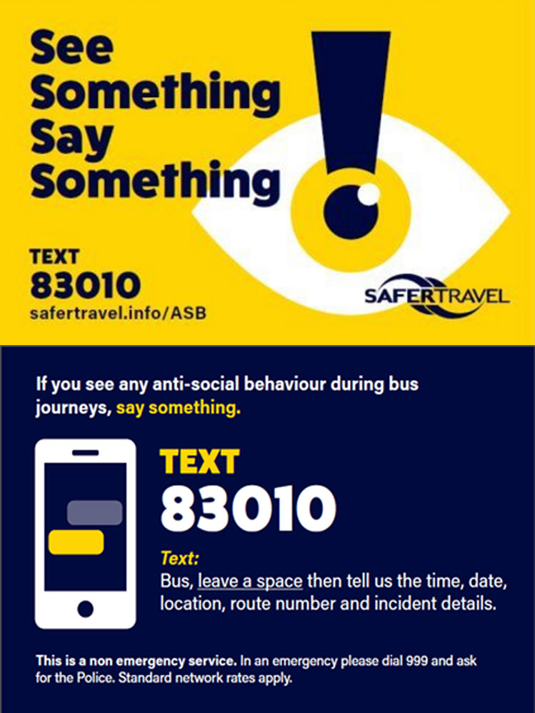 Are you experiencing anti-social behaviour on your journey? You can simply text us to report, start your message with the word "Bus" followed by a space to 83010, with a message giving as much information as possible about the nature of the incident