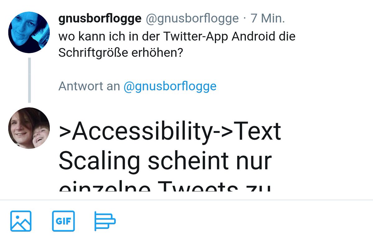 Hmm, Setting->Accessibility->Text Scaling scheint nur einzelne Tweets zu vergrößern, nicht die Timeline, und auch schlecht umgesetzt, wenn der Platz dafür nicht angepasst wirdpic.twitter.com/wVE7T6ums9