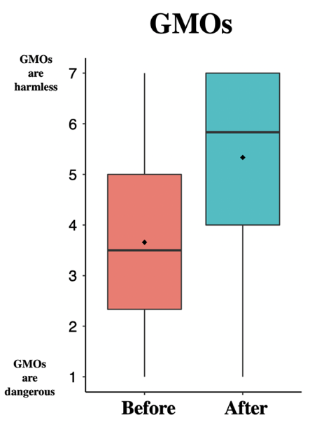 In the case of GMOs the shift was drastic: most participants came to our workshop thinking that GMOs are somewhat dangerous for human health and left thinking that GMOs were more or less harmless.pic.twitter.com/dDbObXUCbG