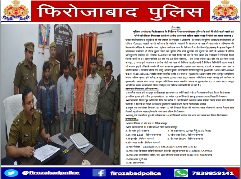 @Sachindra_IPS के निर्देशन मे थाना पचोखरा पुलिस को मिली बड़ी सफलता,स्कूल और कॉलेज में चोरी करने वाले गिरोह का किया पर्दाफ़ाश,5 अभियुक्त गिरफ्तार कब्जे से अवैध असलाह सहित भारी मात्रा में चोरी का माल बरामद ।@dgpup@Uppolice@adgzoneagra@igrangeagrapic.twitter.com/8y5I7NHAWx