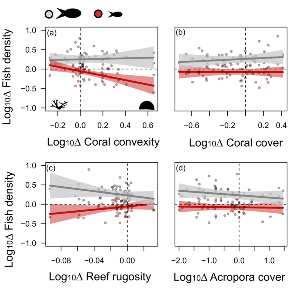 Turns out changes in the 'shape' of coral reefs, rather than percent live corals, has a bigger impact on juvenile fishes after a mass bleaching event. Cool new paper by