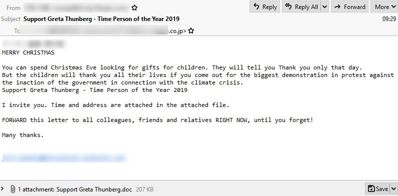 #malicious#email#campaign leveraged a number of topical lures in a single message that attempts to deliver#Emotet. This campaign combines the following elements: -#GretaThunberg - The#Christmas holidays - Environmental awareness and activism https://www.proofpoint.com/us/corporate-blog/post/emotet-wishes-you-merry-christmas-greta-thunberg …pic.twitter.com/vFuMpw7DLf