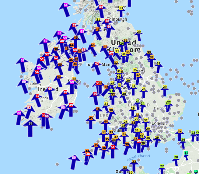 #windgusts from#StormBrendan in mph Note how Northern Ireland and the Republic of Ireland are bearing the brunt. Strengthening winds for the@itvanglia this afternoon and into this evening around 45 mphpic.twitter.com/H3hBq9Xt6n