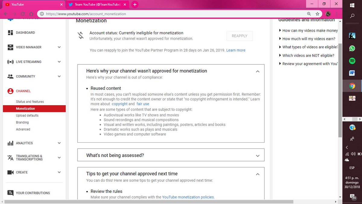 Hola, si. El 16 de diciembre mi canal se sometio a revision. Y la respuesta cuando reviso hoy es que el canal tiene material reusado y por eso no se puede monetizar cuando todo el contenido es legitimo y libre de pixabay y me encargue bastante bien antes del primer video