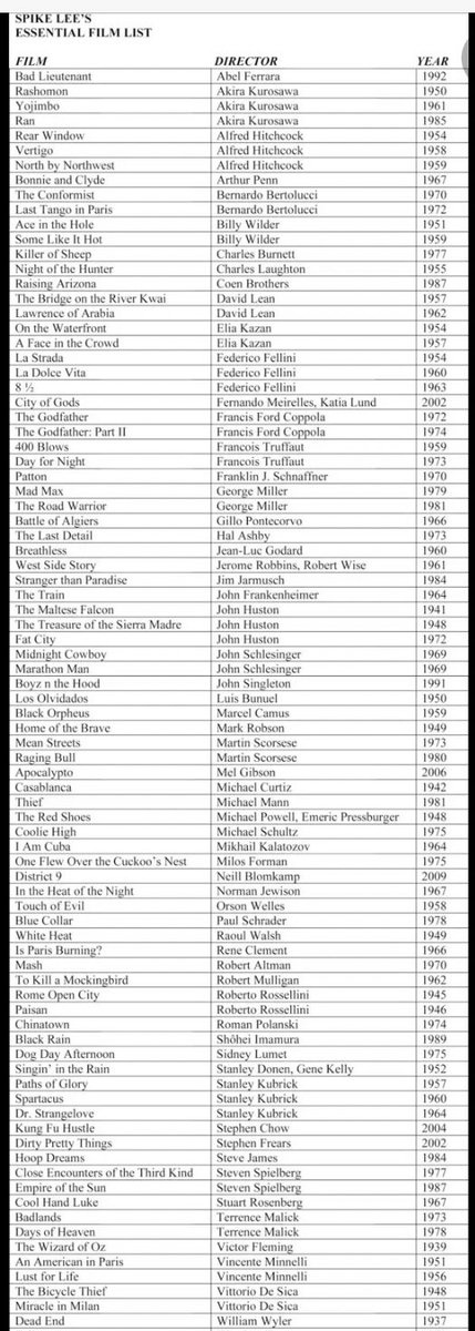 É sempre impactante pensar que Spike Lee dá aula pra alunos da graduação do curso de cinema da Universidade de NY, né?! Essa é a lista de “filmes indispensáveis” que o mestre mandou pra garotada. Falta algum fundamental?pic.twitter.com/Jmw19VMNfB