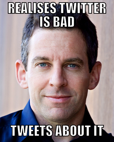 @SamHarrisOrg addiction? please keep tweeting. It was sad enough when John Mayer cancelled his twitter account, I miss his funny tweets. -