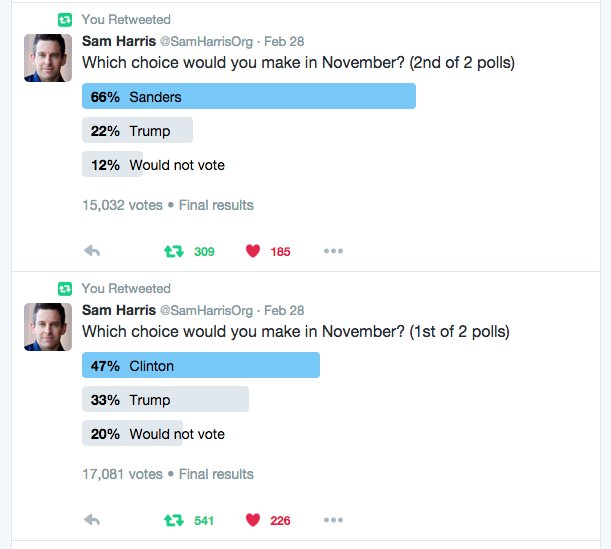 @SamHarrisOrg "Which choice would you make in November?"#FeelTheBern v#ImWithHer v#Trumppic.twitter.com/V6GsqL2qwq