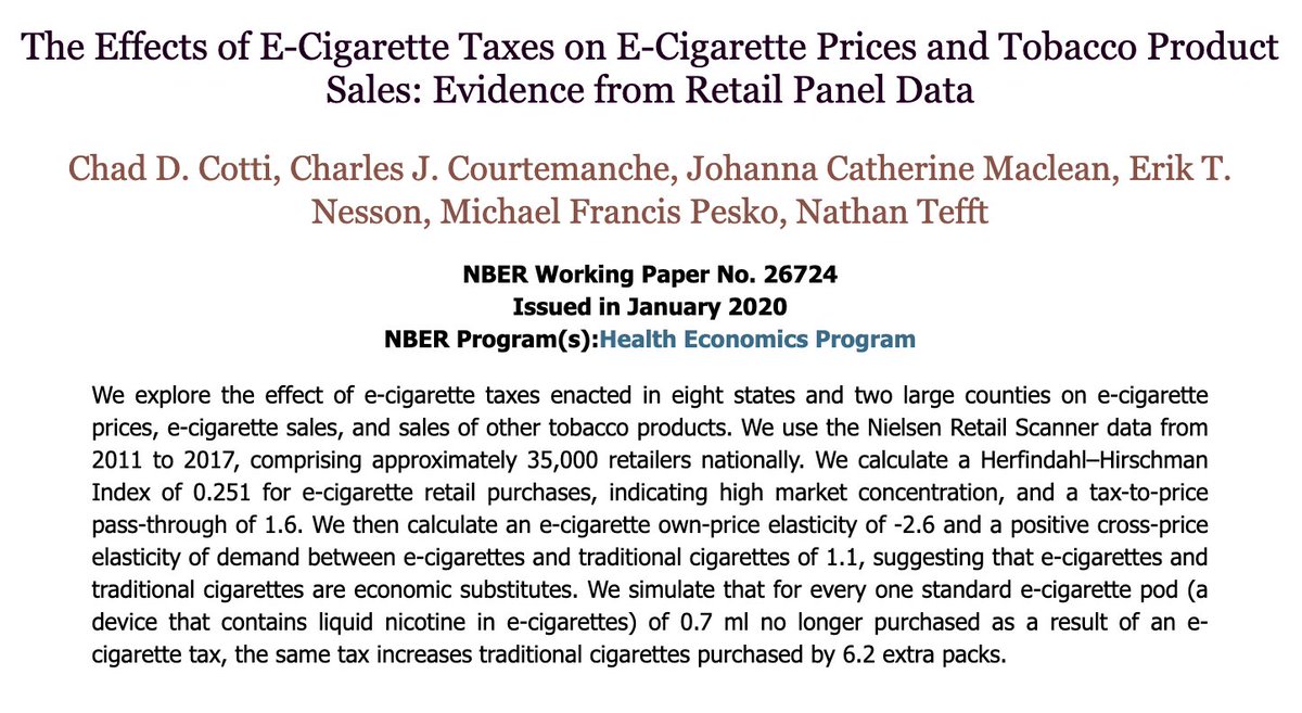 New study: "For every one standard e-cigarette pod (a device that contains liquid nicotine in e-cigarettes) of 0.7 ml no longer purchased as a result of an e-cigarette tax, the same tax increases traditional cigarettes purchased by 6.2 extra packs." https://www.nber.org/papers/w26724#fromrss …pic.twitter.com/41CFl69GDI
