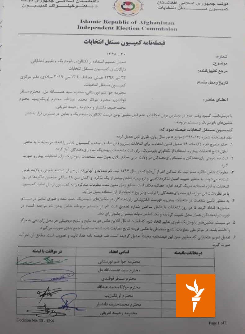 کوم سندونه چې ازادي راډیو ته رسېدلي ښيي د انتخاباتو خپلواک کمېسیون به د ولسمشرۍ انتخاباتو کې د رأی ورکولو پر مهال له بایومټریک سیستم نه کار وانه‌خلي. دغه کمېسیون پرېکړه کړې چې د انتخاباتو قانون د ۱۹مې مادې دوهم بند چې په انتخاباتو کې د ټکنالوژۍ کارول مطرح دی، د تطبیق وړ نه‌دی. pic.twitter.com/1o0WReq5OM