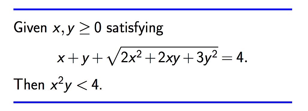 In fact, if x,y >= 0 and x+y+sqrt(2x^2+2xy+3y^2)<=4 then x^2y<1pic.twitter.com/K1EWran9cr