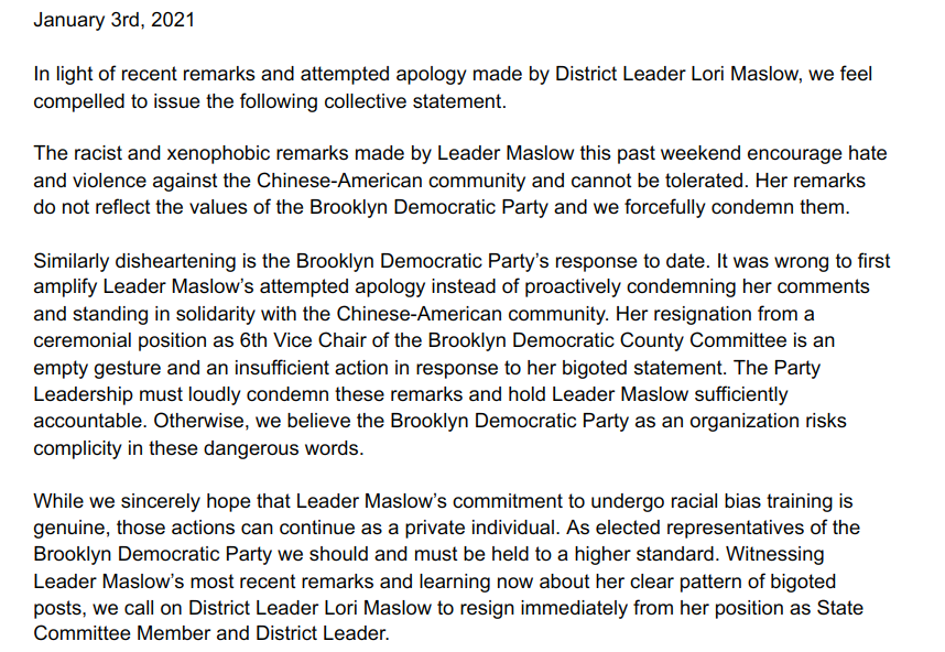 Statement: “The racist & xenophobic remarks made by Leader Maslow this past weekend encourage hate and violence against the Chinese-American community and cannot be tolerated. Her remarks do not reflect the values of the Brooklyn Democratic Party and we forcefully condemn them.”