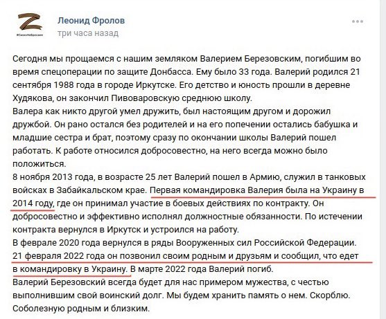 Мэр Иркутского района Леонид Фролов написал пост ВК о гибели в Украине уроженца Иркутска. И выдал сразу две «военные тайны».