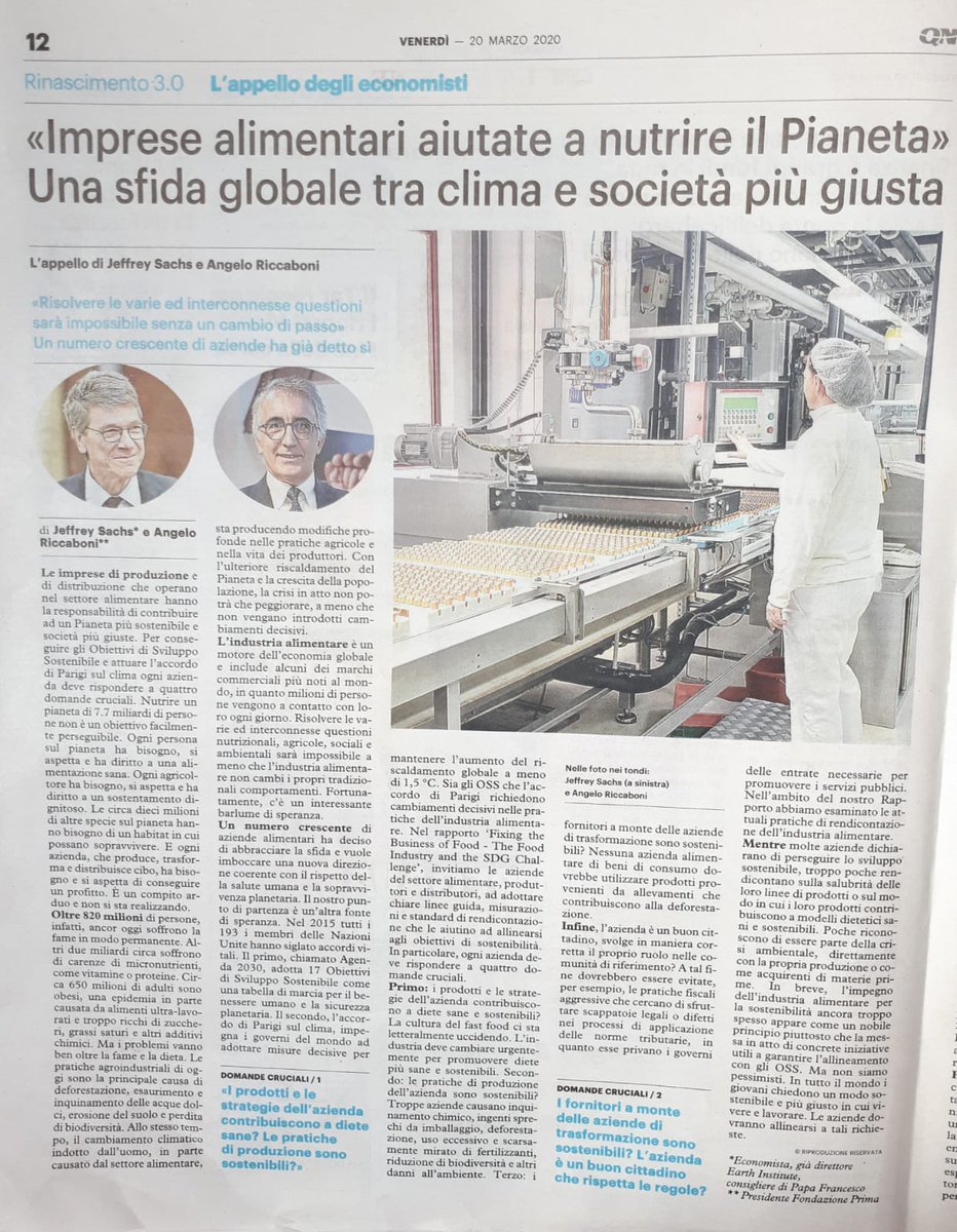 "Imprese alimentari aiutate a nutrire il pianeta": oggi su #QN http://Quotidiano.net , l'appello di #JeffreySachs e @AngeloRiccaboni sul ruolo chiave delle aziende #agrifood per gli #SDGs #Agenda2030.