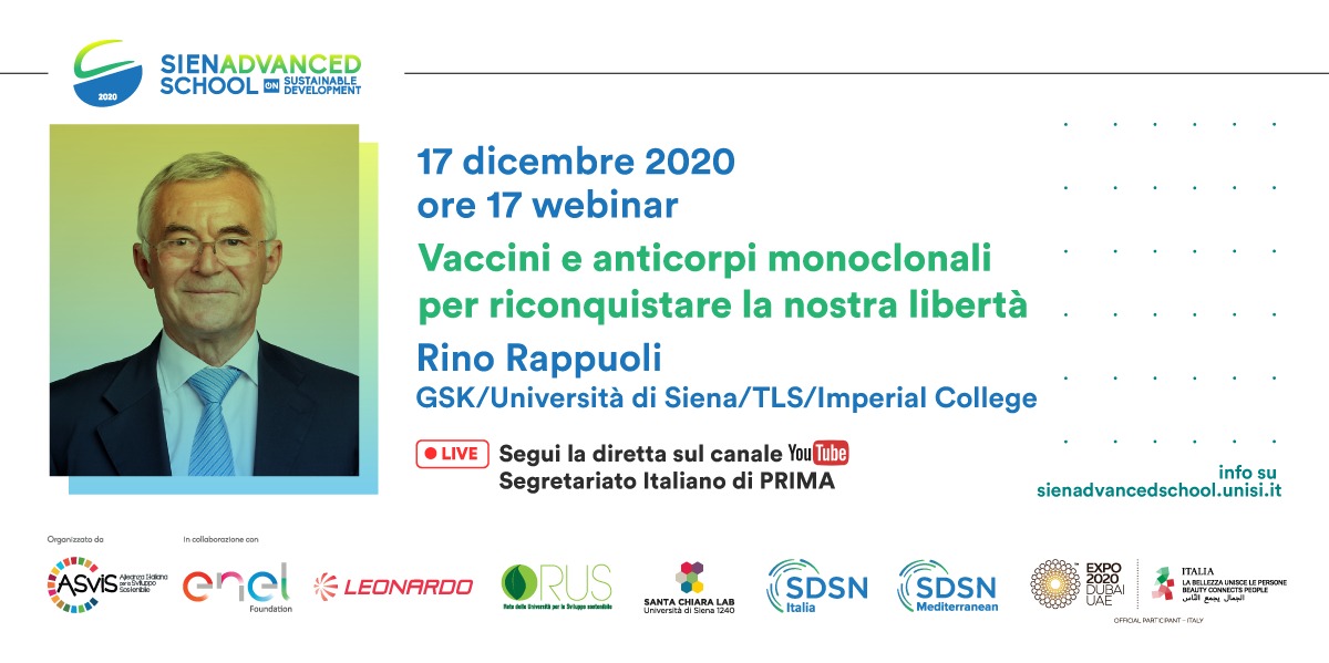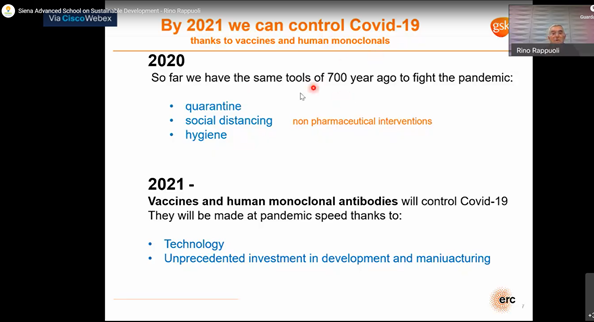 Il prof #RinoRappuoli @GSK ospite alla #SienAdvancedSchoolSDGs con una lezione su vaccini e terapie anti #Covid. Decisivi l'#innovazione tecnologica, la cooperazione internazionale e lo sforzo finanziario per sostenere la ricerca.