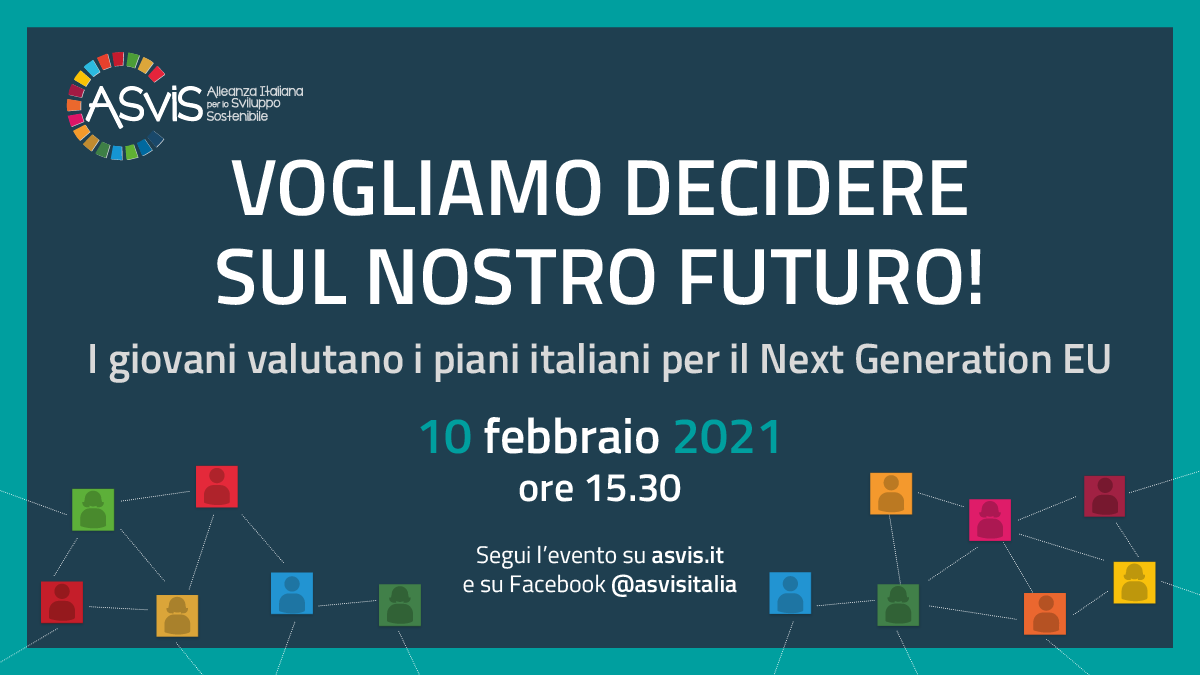 Mercoledi 10 febbraio h 15:30 "Vogliamo decidere sul nostro futuro!" - segui in diretta sui canali ASviS l'evento che vede protagoniste diverse organizzazioni giovanili e in cui i giovani valutano i piani #NextgenerationEu. Programma su https://bit.ly/3jlfrRH  pic.twitter.com/F7Tk7HFR8W