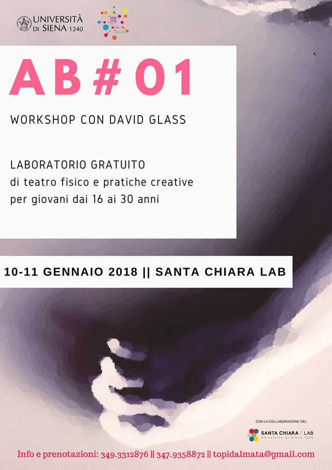 10-11/1/2018. Workshop con #DavidGlass - Laboratorio gratuito di #teatro fisico e pratiche creative. Per info e prenotazioni: http://santachiaralab.unisi.it/news/workshop-con-david-glass/ …pic.twitter.com/6cOy1Kkt0T