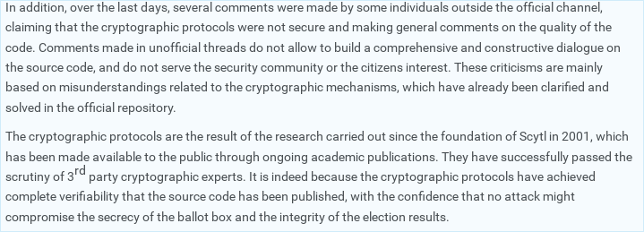 That last point is very important in the context of an issue like the trapdoor we discovered. Do not let people minimize this issue. This isn't "some random hacker can steal an election" this is "SwissPost can prove they didn't steal an election, even if they did"