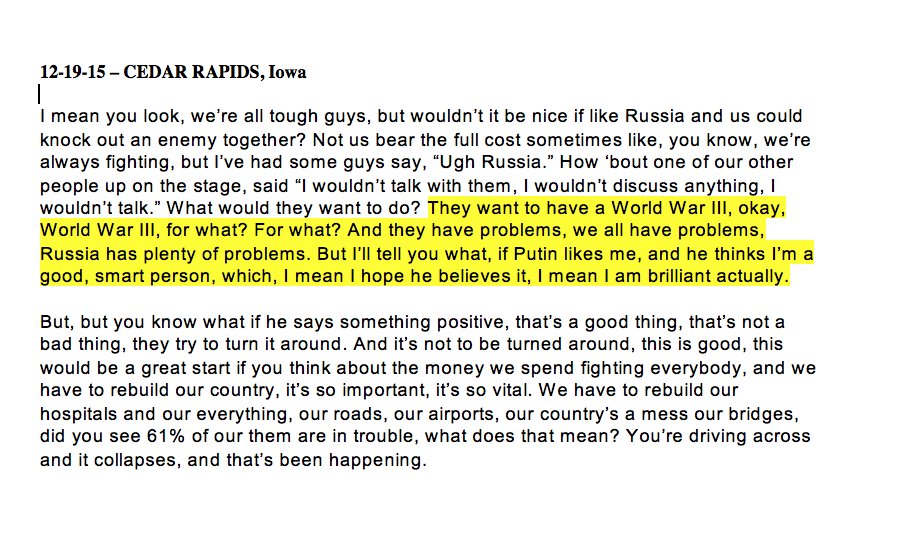Trump, 12/15: "If Putin likes me & he thinks I’m a good, smart person, which, I mean I hope he believes it, I mean I am brilliant actually."pic.twitter.com/o0OfxlZ8K2