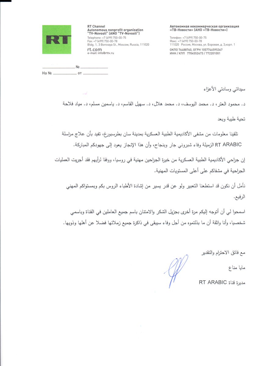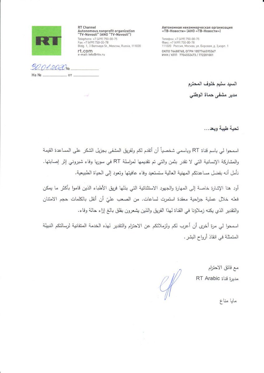 @RTarabic وفاء شبروني@RTArabic_wafa، فقد استعادت وعيها. والمشفى في سان بطرسبورغ حيث تعالج وفاء، أكد أن العمليات الجراحية التي أجريت لها في مشفى حماة الوطني كانت على أعلى مستويات المهنية. أجدد شكري العميق وامتناني للفريق الطبي بمشفى حماة الوطني.pic.twitter.com/psUDQpF5pE