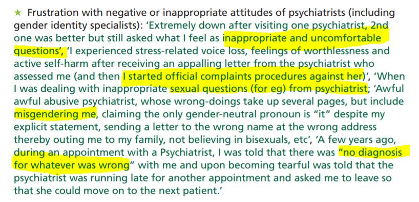 The following screen snips are directly pulled from the big 2012 UK Trans Survey by McNeil, Bailey et. al., accessible here: http://bit.ly/2WfmtuG - read it for yourself and tell me what you see...