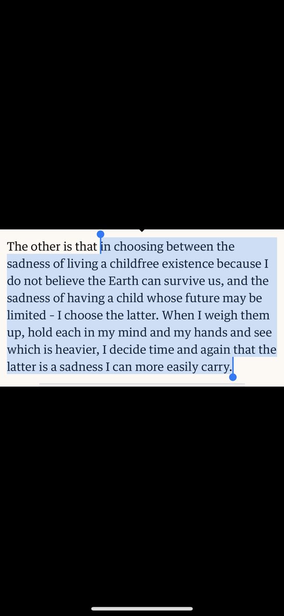 Thanks for sharing this! It’s interesting she actually spells out how her decision to reproduce is based on her own needs, with zero reference to the suffering her child would obviously undergo in the catastrophic world she anticipates.pic.twitter.com/p9ceKw7MQI