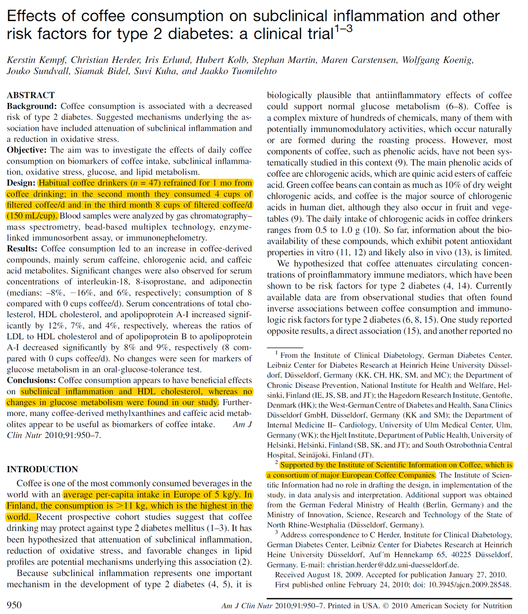 #coffee to reduced diabetes risk. The study - partly sponsored by coffee industry - found consuming 1.2L of coffee/day had some modest effect on subclinical#inflammation - no effect on glucose metabolism. https://watermark.silverchair.com/950.pdf?token=AQECAHi208BE49Ooan9kkhW_Ercy7Dm3ZL_9Cf3qfKAc485ysgAAAmgwggJkBgkqhkiG9w0BBwagggJVMIICUQIBADCCAkoGCSqGSIb3DQEHATAeBglghkgBZQMEAS4wEQQMhc4HsppwCCqtzDejAgEQgIICG8SPxc4E0KY_Kyd276AbL4g-bc_sRtHYfeknba0HRYbq6WPJCvyEHmQln45h-EJFMPs-hjFD1C_dtd4_MiyIbb0DT36rEY1chFn-UQGIb8zg3hleYlF2KoA3FZEz57rz5qwwcC8pXQXEEakm-as93dy7dflHbdEShwnkj7nik6WHj4m2zhcR2MTXaGayIbzAuMVc1uAj7kSPZFCGj2LS5FvM7grfxZDKau-brG5TZrNQHQyOmPlZmPhcRWIZb2snxAHN4aaDGbiVHKGpqe-VZeSKiWJ9PPBmBE6i3kqg_9nrC6zhhAVNG9F60BSgcJDRH-cE8NaI2qOUu-zeQm65-dNNbijcO3-IxPH_vTyVm9VFBUO8nO14kcADpUfjojKpMU6Cv8A0hfdN_SRXD32h4ANWnWqsN4dPkUdDT8kCCx4kXET4HYRVT_oCVjK3Jip30B1qFrOc-nys9a_qZ9Em0fQmQK3jrUHsPmKI9Qf0s5E0l5fMDt5y1jLSBzUeKPdKC6QEedqlc_VYHf365brflFG442C-Wx2yh3w7zuoVKDa6QnbgNa7Sflp66NVIm3627BX5JfGQZTV3kxt2QgV3ndXzvcxACXzfu0QYc105H19ALQiRln5l_OWKID_75x61jbB02oJp4I8TmrZlT2F-JS66bXRn7WX_EoquF9bjARlvow-9fjquKhOLo9vgzBVZAXhXE5wJDi5UAZ9t …pic.twitter.com/i5ajsepu3r