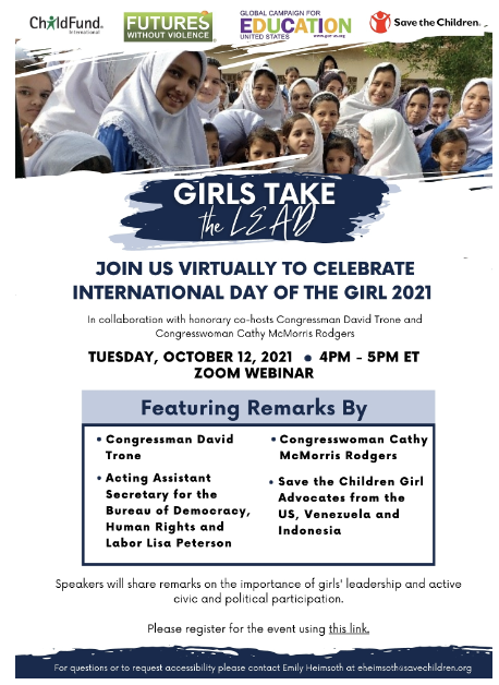 Starting soon! Girls Take the LEAD event featuring girl advocates, @RepDavidTrone,@CathyMcmorris, and AA/S@StateDRL Lisa Peterson TODAY at 4pm ET discussing the#GirlsLEADAct! Register now: https://bit.ly/GLA_Hill !@SaveTheChildren@SCActionNetwork@ChildFund@WithoutViolencepic.twitter.com/q0XVsZlwkk