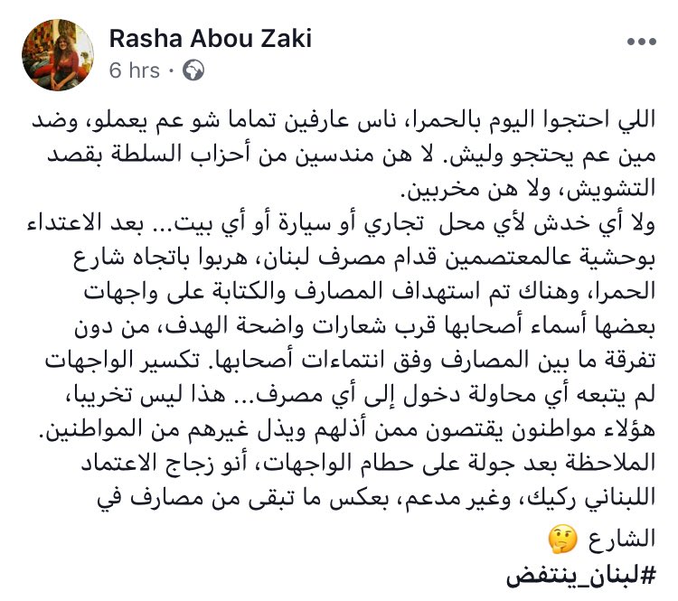 انتفاضة 17 تشرين ،كان فيها الفقير من كل الطوايف ،عم بطالب انو ما بقى ننزل ،ونتبهدل.التدخلات قتلت الثورة ...علينا احياء الثورة،ثورة ضد المصارف، ضد الدولة،ضد مصرف لبنان،ضد الفقر والذل،ثورة ضد الخوف ، ثورة فعلية ضد الطبقة المخملية اللي ناكت اخت البلد ...ثورة ضد البلطجية