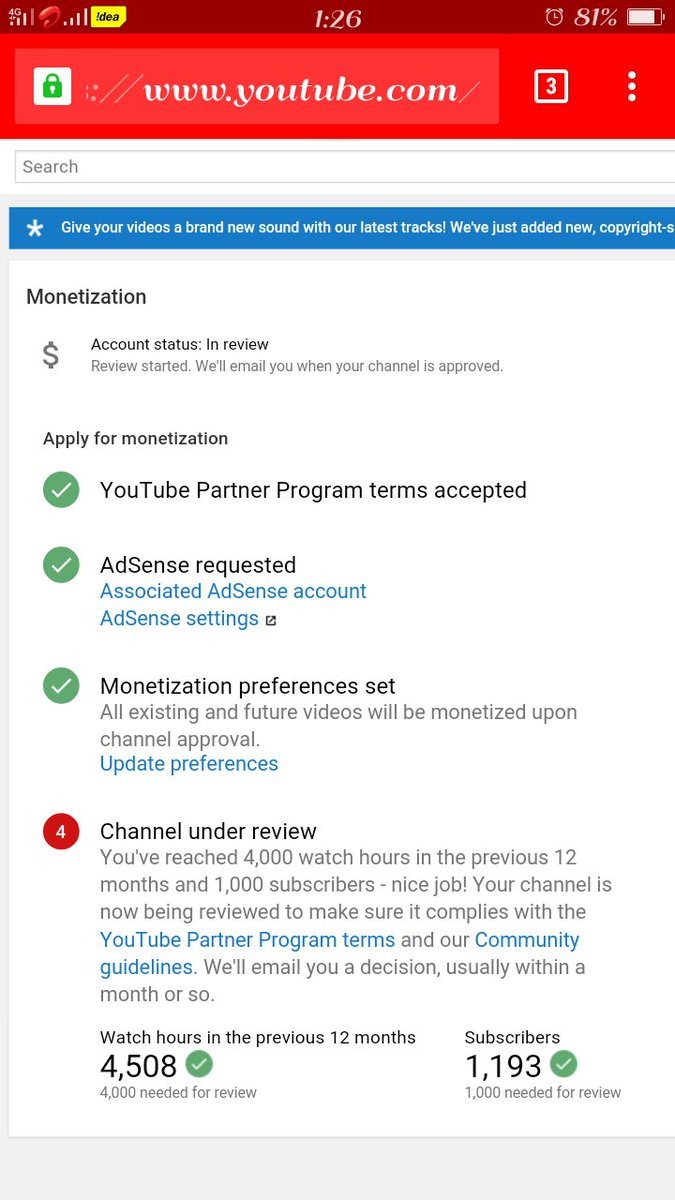 @TeamYouTube @TeamYouTube Dear Team YouTube I have already complete 4k hours and 1k subscribe in previous 365 days and dy channel under review till one month .But monetization is not enable .plz guide us.