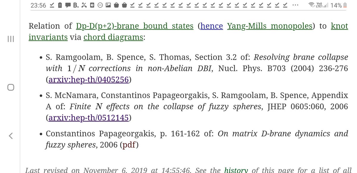 There is a most curious expression of observables on time-dependent Dp/D(p+2)-brane bound states (=Yang-Mills monopoles in the D(p+2) worldvolume) as knot invariants, specifically as sl2 weights systems on chord diagrams: http://ncatlab.org/nlab/show/Dp-D%28p%2B2%29-brane+bound+state#ReferencesRelationToKnotInvariants …pic.twitter.com/YvPVDS1tuw