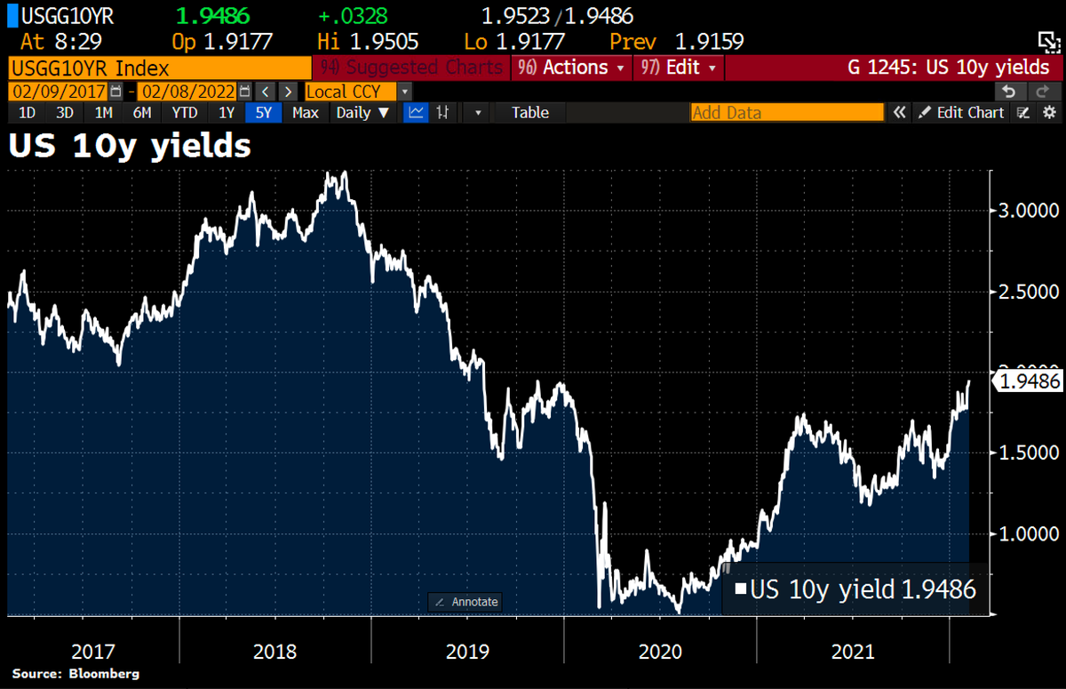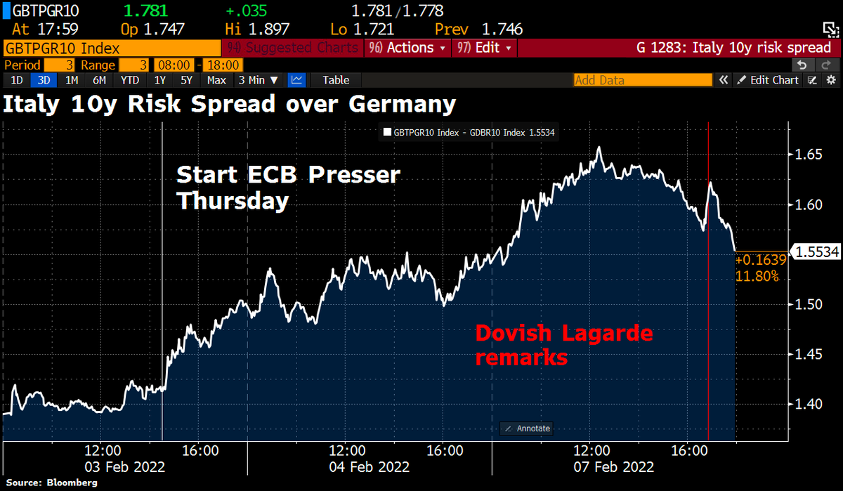 #ECB's Lagarde tries to soothe bond mkt investors w/dovish remarks after Italy's yield spiked. Says no need for big ECB tightening as inflation to hold at target. https://www.reuters.com/world/europe/euro-zone-inflation-could-subside-before-becoming-entrenched-lagarde-2022-02-07/ …pic.twitter.com/3avV8KJEx5