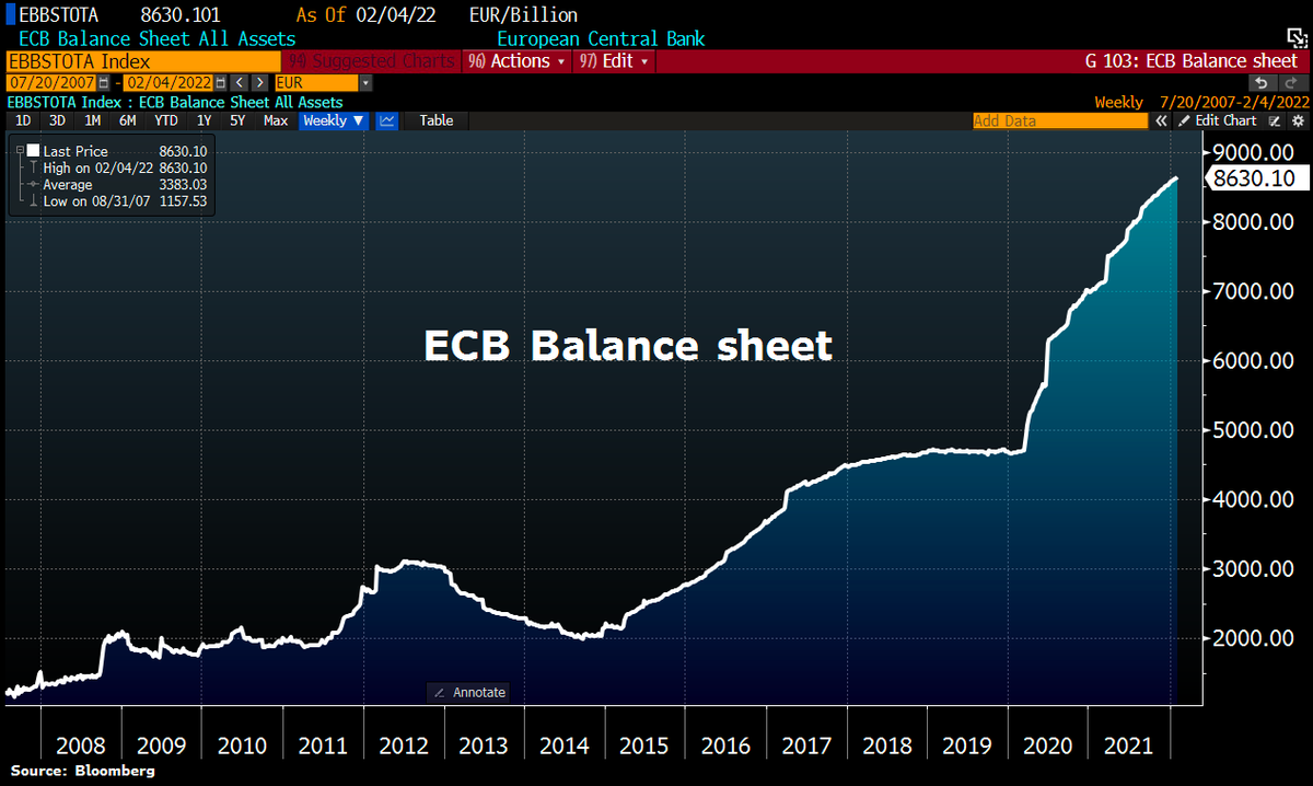 #ECB balance sheet hit fresh ATH after last week's meeting as Lagarde keeps printing press rumbling regardless of rising inflation. Total assets rose by another €7.5bn to €8,630.1bn, equal to 81.8% of Eurozone GDP vs Fed's 37%, BoJ's 135%, BoE's 42%.pic.twitter.com/yHCtzeshet