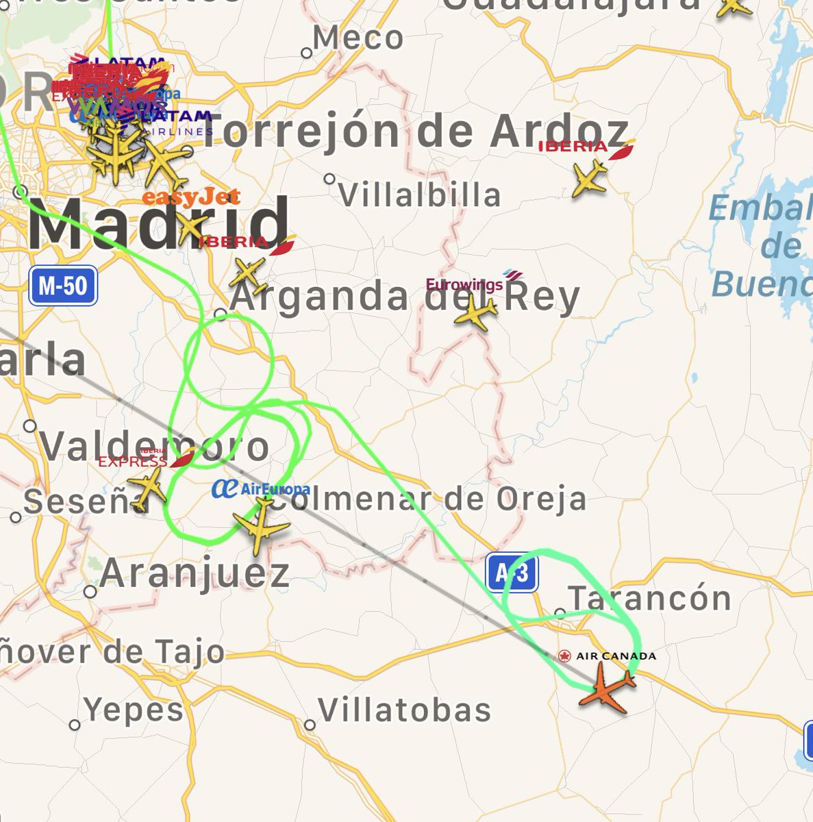 Air Canada 767 currently holding near to Madrid Barajas following the incident upon take off — the aircraft is now burning fuel ahead of an emergency landing.