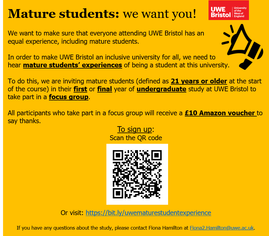 Are you a mature student at UWE in your first or final year of undergraduate study? UWE are looking for participants to take part in a focus group about their experiences of being a mature student at UWE. All participants will receive a £10 Amazon voucher to say thanks!pic.twitter.com/up3NxdpjYC