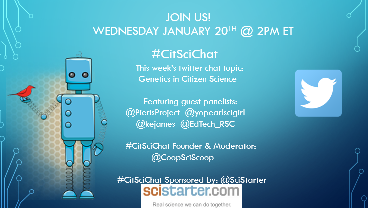 Today's #CitSciChat in 30 min w/ @CoopSciScoop @PierisProject @yopearlscigirl @kejames @EdTech_RSC #genetics #citscipic.twitter.com/6ch4FhwNfb