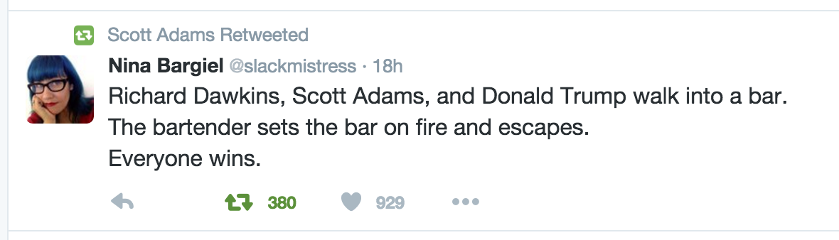 @ScottAdamsSays haha bluehair dontcareThanks. Twitter will use this to make your timeline better. UndoUndo